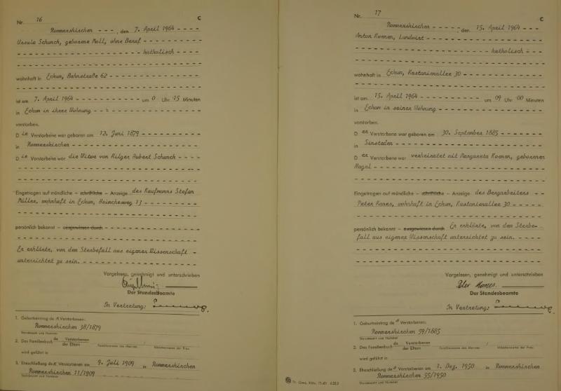 | aktuell | 08:25, 21. Jun. 2013 | 1.784 × 2.277, 36 Seiten (5,85 MB) | KlausErdmann (Diskussion • Beiträge) | {{Information |Beschreibung = ;Standesamt Rommerskirchen, Sterberegister von 1964 |Quelle = Archiv im Rhein-Kreis Neuss |Urheber = |Datum = 1964 |Scans = Klaus Erdmann ''(Repro: 20. Juni 2013)'' |Genehmig |