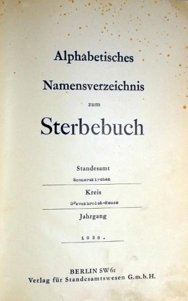 | aktuell | 15:05, 15. Mai 2013 | 1.613 × 2.116, 14 Seiten (4,13 MB) | KlausErdmann (Diskussion • Beiträge) | {{Information |Beschreibung = ;Standesamt Rommerskirchen, Sterberegister von 1938 - Band 2 (Nr. 31-40) |Quelle = Archiv im Rhein-Kreis Neuss |Urheber = |Datum = 1938 |Scans = [[User:KlausErdmann|Klaus Erd |