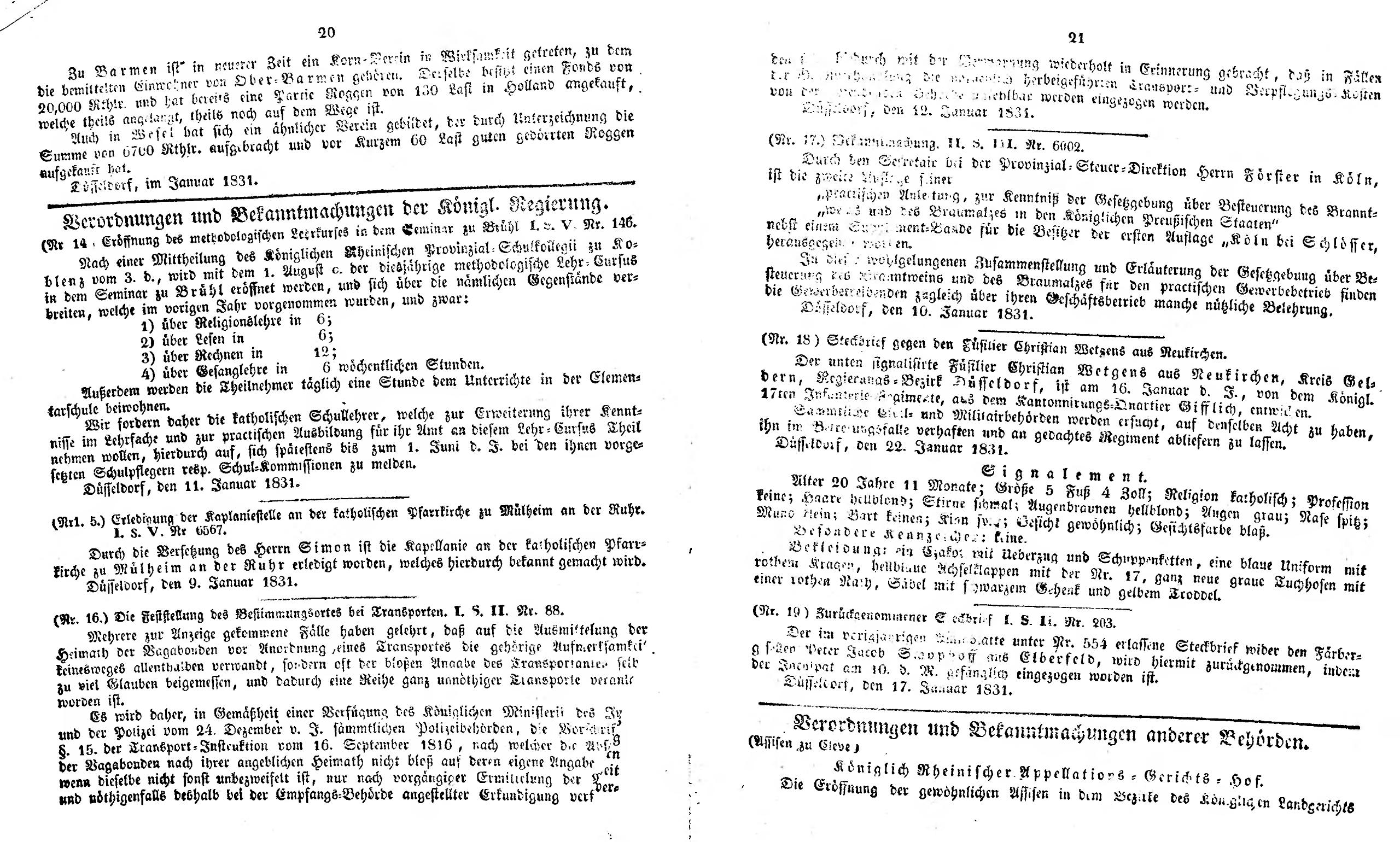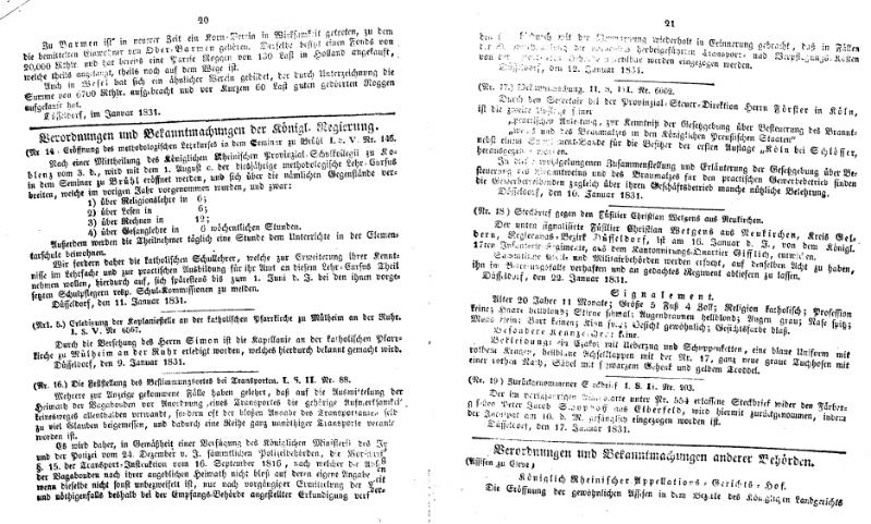 | aktuell | 11:06, 25. Mai 2012 | 2.091 × 2.449, 15 Seiten (987 KB) | KlausErdmann (Diskussion • Beiträge) | {{Information |Beschreibung = ;Amtsblatt der Königlichen Regierung zu Düsseldorf :Jahrgang 1831 - Januar |Quelle = Gemeindearchiv Rommerskirchen |Urheber = Scan & Repro: Klaus Erdmann |Datum = Januar 1831 |Genehmigung = {{Copyrig |