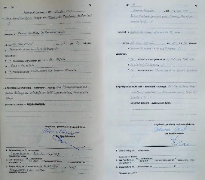 | aktuell | 11:05, 10. Jul. 2013 | 1.200 × 1.651, 34 Seiten (7,84 MB) | KlausErdmann (Diskussion • Beiträge) | {{Information |Beschreibung = ;Standesamt Rommerskirchen, Sterberegister von 1977 |Quelle = Archiv im Rhein-Kreis Neuss |Urheber = |Datum = 1977 |Scans = Bernhard Erdmann ''(Repro: 9. Juli 2013)'' |Genehm |