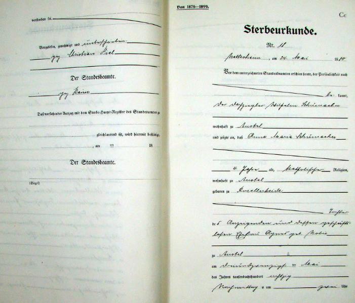 | aktuell | 19:47, 8. Mär. 2012 | 1.225 × 1.797, 49 Seiten (8,18 MB) | KlausErdmann (Diskussion • Beiträge) | {{Information |Beschreibung = ;Bürgermeisterei Nettesheim, Sterbe-Register von 1880 |Quelle = Gemeindearchiv Rommerskirchen |Urheber = |Datum = 1880 |Scans = Klaus Erdmann ''(Reproduktion: (8. |