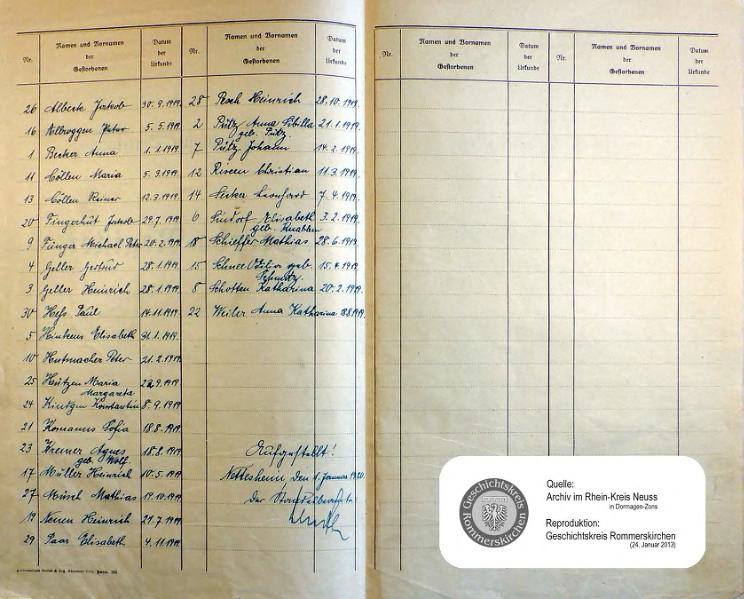 | aktuell | 17:08, 24. Jan. 2013 | 1.128 × 1.655, 19 Seiten (3,16 MB) | KlausErdmann (Diskussion • Beiträge) | {{Information |Beschreibung = ;Standesamt Nettesheim, Sterberegister von 1919 |Quelle = Archiv im Rhein-Kreis Neuss |Urheber = |Datum = 1919 |Scans = Klaus Erdmann ''(Repro: 24. Januar 2 |
