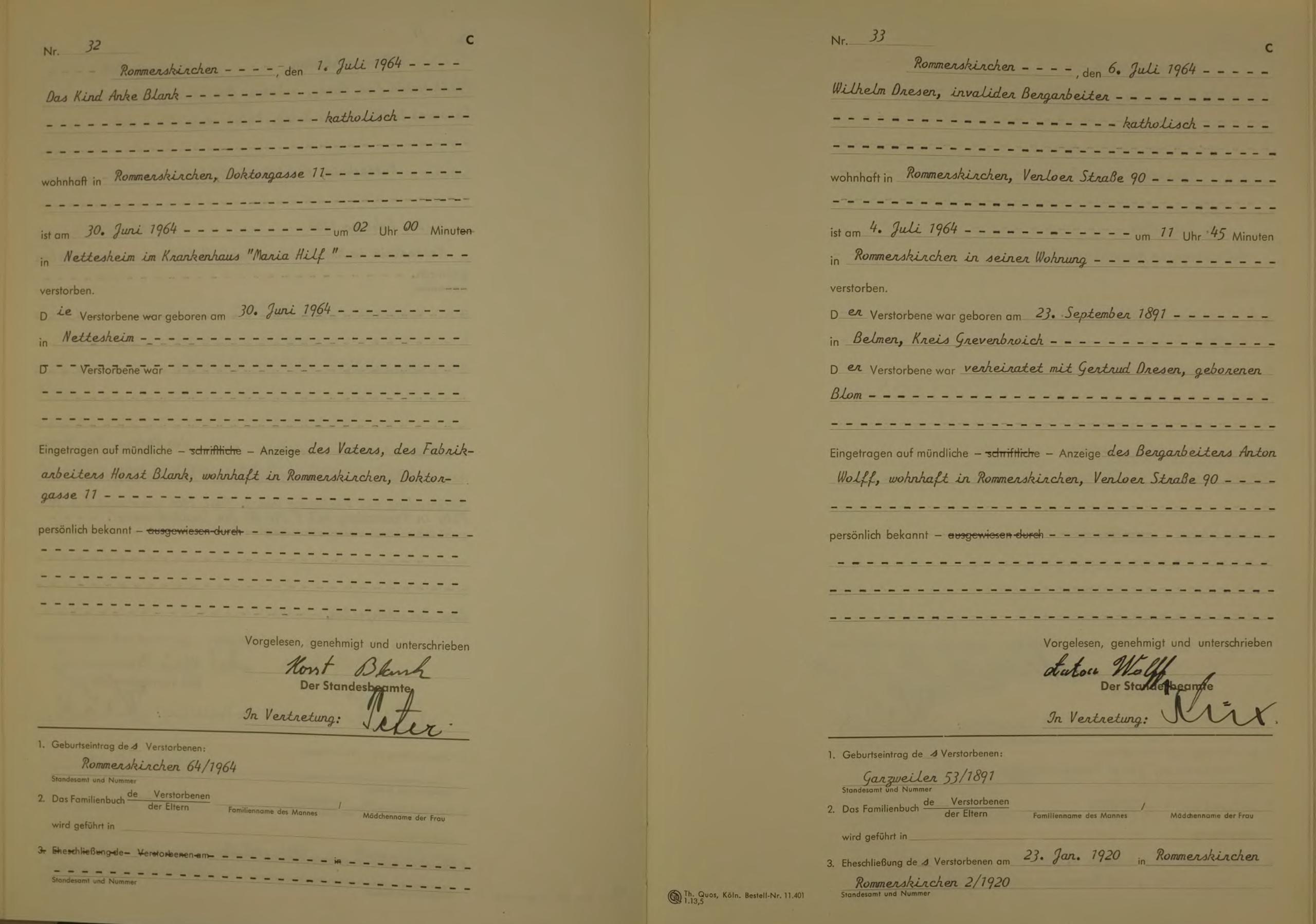 | aktuell | 08:25, 21. Jun. 2013 | 1.784 × 2.277, 36 Seiten (5,85 MB) | KlausErdmann (Diskussion • Beiträge) | {{Information |Beschreibung = ;Standesamt Rommerskirchen, Sterberegister von 1964 |Quelle = Archiv im Rhein-Kreis Neuss |Urheber = |Datum = 1964 |Scans = Klaus Erdmann ''(Repro: 20. Juni 2013)'' |Genehmig |