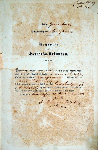 | aktuell | 14:29, 16. Mai 2011 | 1.616 × 2.451, 40 Seiten (17 MB) | KlausErdmann (Diskussion • Beiträge) | {{Information |Beschreibung = ;Gemeinde Evinghoven:Register der Heirats-Urkunden für das Jahr 1864 |Quelle = Gemeindearchiv Rommerskirchen |Urheber = |Datum = 1864 |Scans = Klaus Erdmann ''(Re |