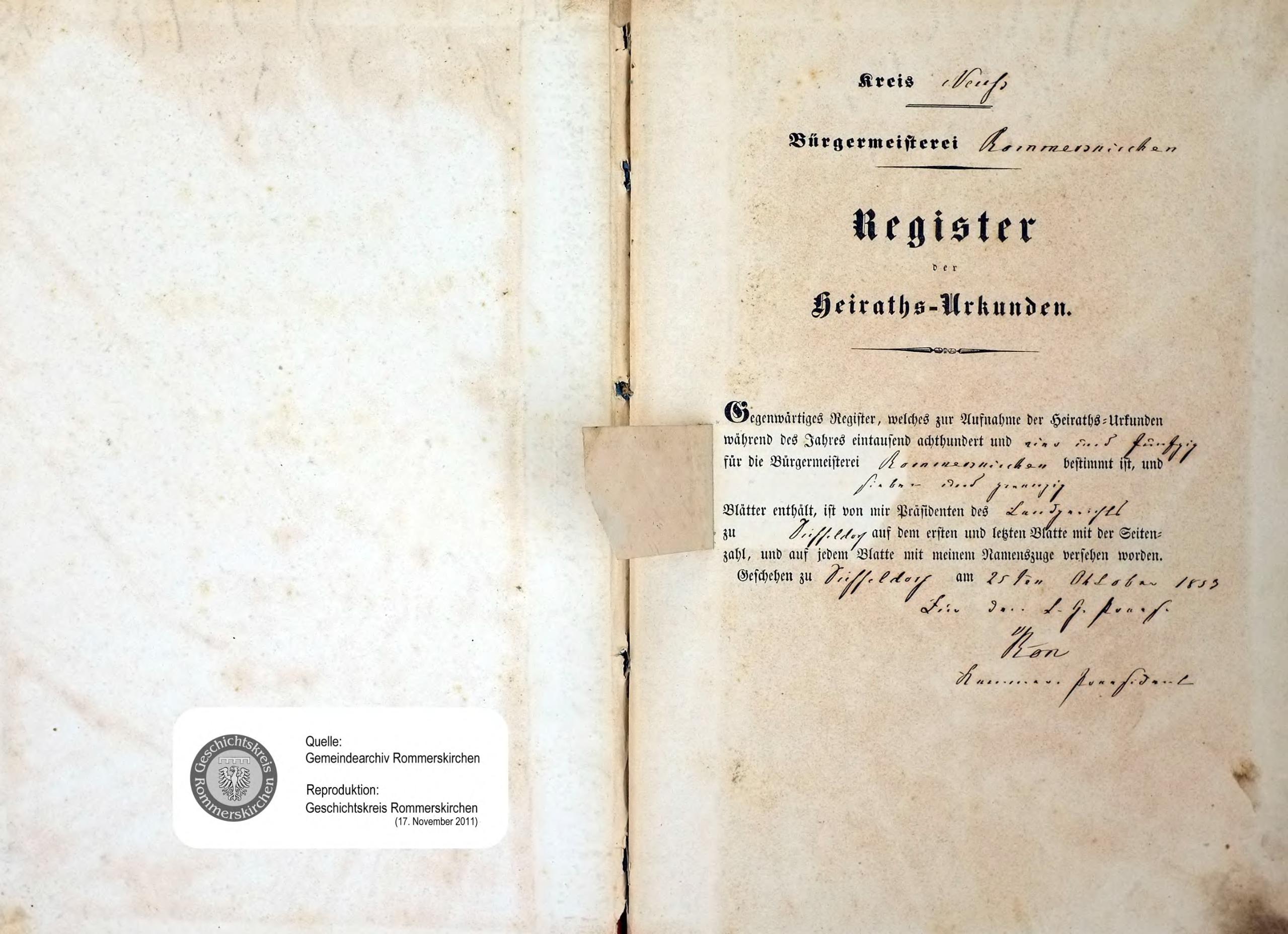 - Standesamt Rommerskirchen, Register der Heirats-Urkunden für das Jahr 1854