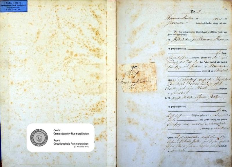 Standesamt der Gemeinde Rommerskirchen, Register der Heirats-Urkunden für das Jahr 1881