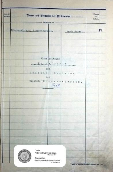 | aktuell | 09:42, 23. Mär. 2013 | 1.633 × 2.292, 3 Seiten (941 KB) | KlausErdmann (Diskussion • Beiträge) | {{Information |Beschreibung = ;Standesamt Rommerskirchen :Alphabetisches Namenverzeichnis zum Heiratsregister 1913 |Quelle = Archiv im Rhein-Kreis Neuss |Urheber = |Datum = 1913 |Scans = Klaus Erdmann ''(0 |