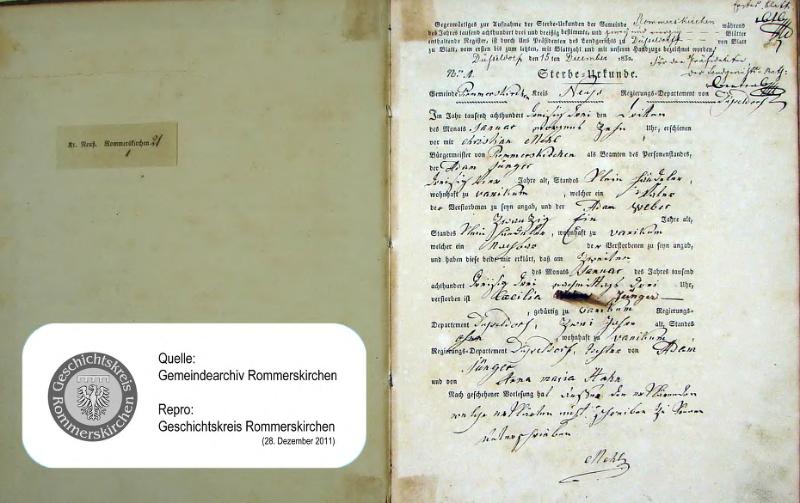 | aktuell | 10:16, 30. Dez. 2011 | 958 × 1.235, 18 Seiten (3,17 MB) | KlausErdmann (Diskussion • Beiträge) | {{Information |Beschreibung = ;Bürgermeisterei Rommerskirchen, Sterbe-Urkunden 1833 |Quelle = Gemeindearchiv Rommerskirchen |Urheber = |Datum = 1833 |Scans = Klaus Erdmann ''(Repro: 28. Dezemb |