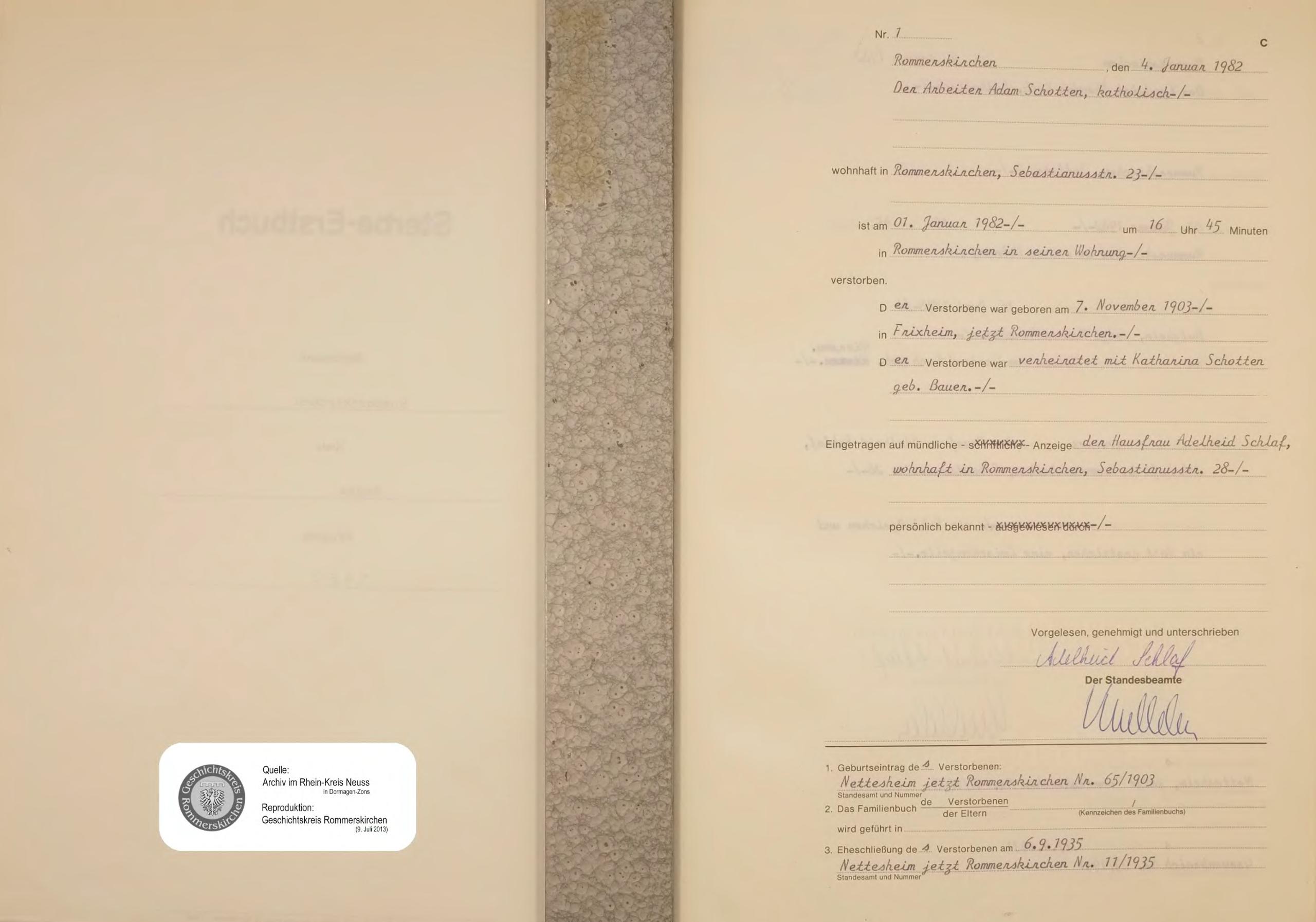 | aktuell | 17:00, 9. Jul. 2013 | 1.702 × 2.272, 38 Seiten (7,49 MB) | KlausErdmann (Diskussion • Beiträge) | {{Information |Beschreibung = ;Standesamt Rommerskirchen, Sterberegister von 1982 |Quelle = Archiv im Rhein-Kreis Neuss |Urheber = |Datum = 1982 |Scans = Bernhard Erdmann ''(Repro: 9. Juli 2013)'' |Genehm |