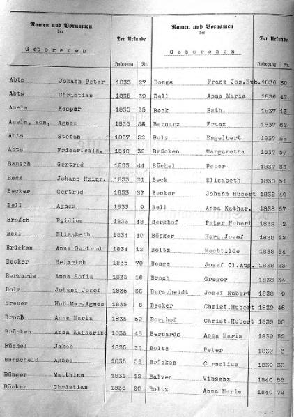 | aktuell | 14:51, 2. Okt. 2010 | 950 × 1.341, 16 Seiten (4,48 MB) | KlausErdmann (Diskussion • Beiträge) | {{Information |Beschreibung = ;Alphabetische Zehnjahres-Liste des Standesamtes Rommerskirchen:Geburten 1833 - 1842 |Quelle = Gemeindearchiv Rommerskirchen |Urheber = |Datum = 1833-1842 |Scans = [[User:KlausErdmann|K |
