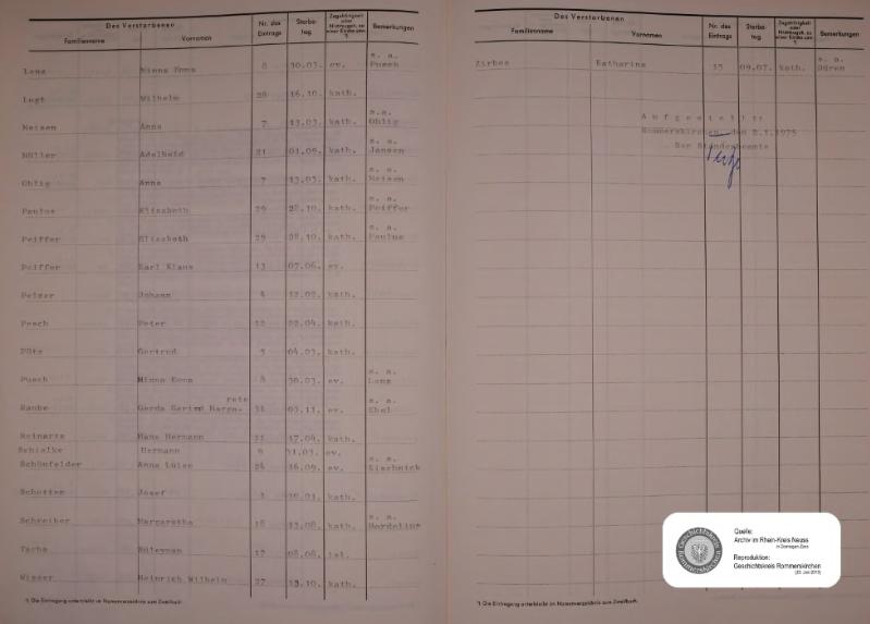 | aktuell | 18:03, 20. Jun. 2013 | 1.450 × 2.100, 20 Seiten (2,98 MB) | KlausErdmann (Diskussion • Beiträge) | {{Information |Beschreibung = ;Standesamt Rommerskirchen, Sterberegister von 1974 |Quelle = Archiv im Rhein-Kreis Neuss |Urheber = |Datum = 1974 |Scans = Bernhard Erdmann ''(Repro: 20. Juni 2013)'' |Gene |