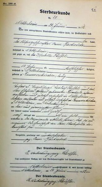 | aktuell | 10:43, 25. Jan. 2013 | 1.881 × 2.511, 44 Seiten (4,77 MB) | KlausErdmann (Diskussion • Beiträge) | {{Information |Beschreibung = ;Standesamt Nettesheim, Sterberegister von 1912 |Quelle = Archiv im Rhein-Kreis Neuss |Urheber = |Datum = 1912 |Scans = Klaus Erdmann ''(Repro: 24. Januar 2 |