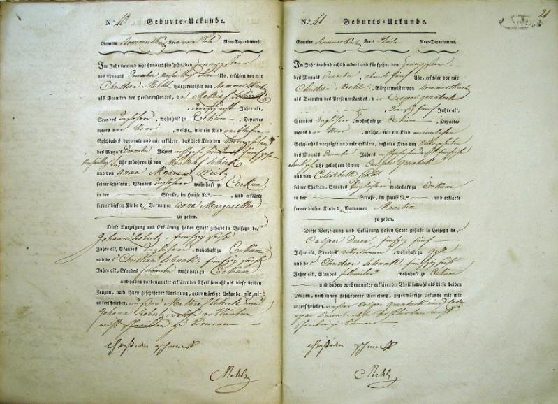 | aktuell | 07:47, 29. Jul. 2011 | 1.323 × 1.910, 24 Seiten (14,44 MB) | KlausErdmann (Diskussion • Beiträge) | {{Information |Beschreibung = ;Bürgermeisterei Rommerskirchen:Geburtsurkunden von 1815 |Quelle = Gemeindearchiv Rommerskirchen |Urheber = |Datum = 1815 |Scans = Klaus Erdmann ''(Repro: 29.07.2011)'' |Genehmigung = {{Approbation-KE |