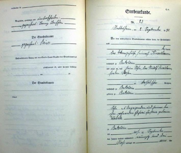 | aktuell | 16:10, 18. Mär. 2012 | 1.158 × 1.701, 49 Seiten (8,39 MB) | KlausErdmann (Diskussion • Beiträge) | {{Information |Beschreibung = ;Standesamt Nettesheim, Sterbe-Register von 1893 |Quelle = Gemeindearchiv Rommerskirchen |Urheber = |Datum = 1893 |Scans = Klaus Erdmann ''(Repro: 16.März 2012)'' |