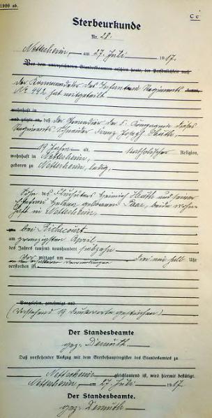 | aktuell | 09:33, 26. Jan. 2013 | 1.881 × 2.511, 62 Seiten (7,07 MB) | KlausErdmann (Diskussion • Beiträge) | {{Information |Beschreibung = ;Standesamt Nettesheim, Sterberegister von 1917 |Quelle = Archiv im Rhein-Kreis Neuss |Urheber = |Datum = 1917 |Scans = Klaus Erdmann ''(Repro: 24. Januar 2 |