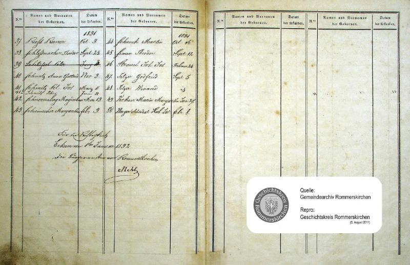| aktuell | 08:47, 6. Aug. 2011 | 1.181 × 1.548, 29 Seiten (13,49 MB) | KlausErdmann (Diskussion • Beiträge) | {{Information |Beschreibung = ;Bürgermeisterei Rommerskirchen:Register der Geburts-Urkunden 1831 |Quelle = Gemeindearchiv Rommerskirchen |Urheber = |Datum = 1831 |Scans = Klaus Erdmann ''(Repr |
