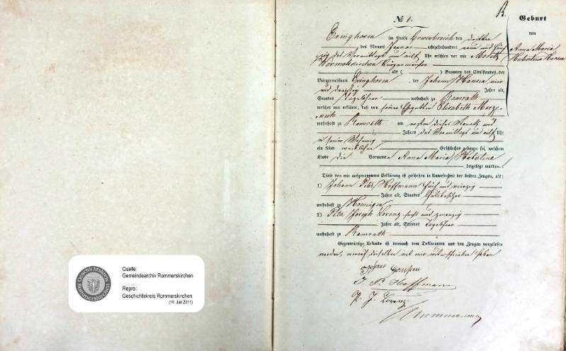 | aktuell | 06:40, 15. Jul. 2011 | 1.513 × 1.921, 45 Seiten (16,31 MB) | KlausErdmann (Diskussion • Beiträge) | {{Information |Beschreibung = ;Bürgermeisterei Evinghoven:Register der Geburts-Urkunden 1859 |Quelle = Gemeindearchiv Rommerskirchen |Urheber = |Datum = 1859 |Scans = Klaus Erdmann ''(Repro: 1 |