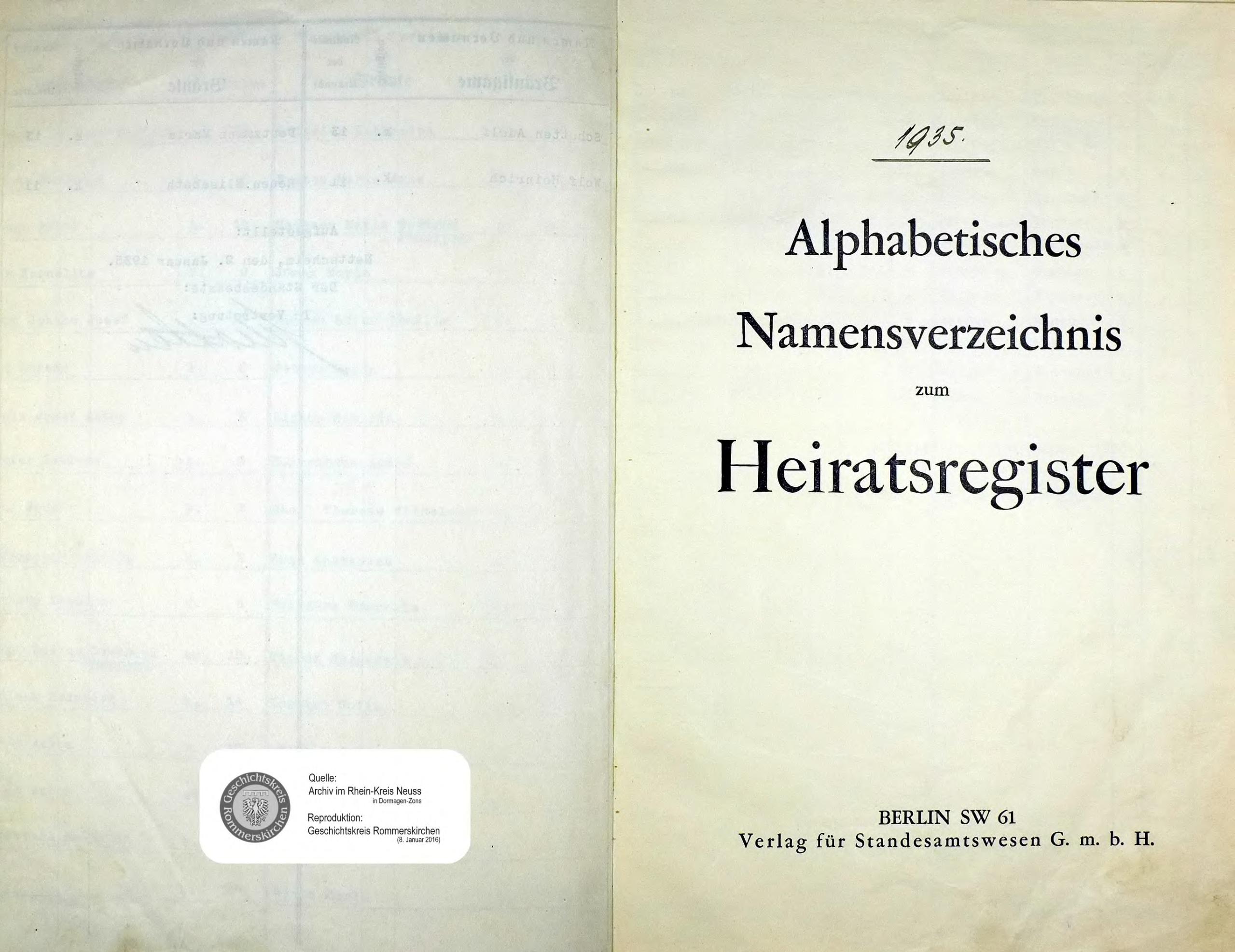 | aktuell | 14:06, 8. Jan. 2016 | 1.601 × 2.421, 4 Seiten (1,18 MB) | KlausErdmann (Diskussion • Beiträge) | {{Information |Beschreibung = ;Standesamt Nettesheim :Alphabetisches Namensverzeichnis zum Heiratsregister 1935 |Quelle = Archiv im Rhein-Kreis Neuss |Urheber = |Datum = 1935 |Scans = Klaus Erdmann ''(Repr |