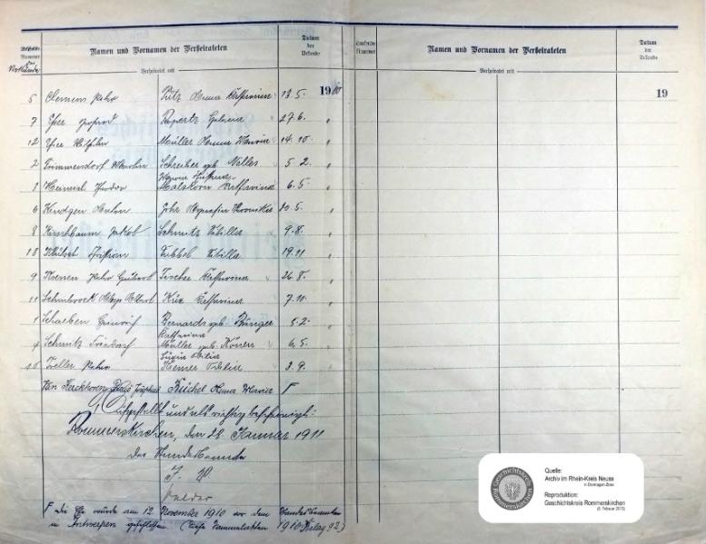 | aktuell | 16:15, 22. Mär. 2013 | 1.617 × 2.290, 3 Seiten (1,02 MB) | KlausErdmann (Diskussion • Beiträge) | {{Information |Beschreibung = ;Standesamt Rommerskirchen :Alphabetisches Namenverzeichnis zum Heiratsregister 1910 |Quelle = Archiv im Rhein-Kreis Neuss |Urheber = |Datum = 1910 |Scans = Klaus Erdmann ''(0 |