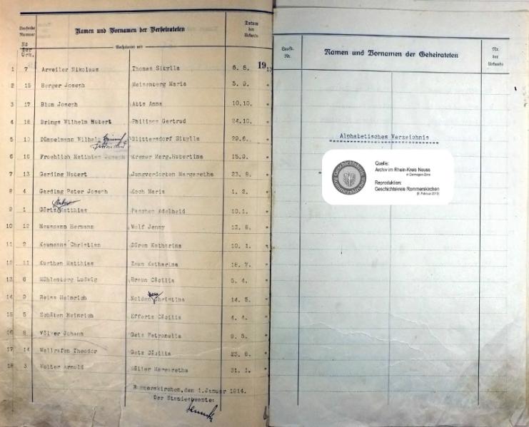| aktuell | 09:42, 23. Mär. 2013 | 1.633 × 2.292, 3 Seiten (941 KB) | KlausErdmann (Diskussion • Beiträge) | {{Information |Beschreibung = ;Standesamt Rommerskirchen :Alphabetisches Namenverzeichnis zum Heiratsregister 1913 |Quelle = Archiv im Rhein-Kreis Neuss |Urheber = |Datum = 1913 |Scans = Klaus Erdmann ''(0 |