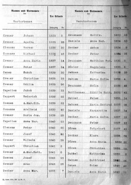 | aktuell | 19:13, 2. Okt. 2010 | 950 × 1.356, 11 Seiten (2,9 MB) | KlausErdmann (Diskussion • Beiträge) | {{Information |Beschreibung = ;Alphabetische Zehnjahres-Liste des Standesamtes Rommerskirchen:Sterbefälle 1833 - 1842 |Quelle = Gemeindearchiv Rommerskirchen |Urheber = |Datum = 1833-1842 |Scans = [[User:KlausErdma |