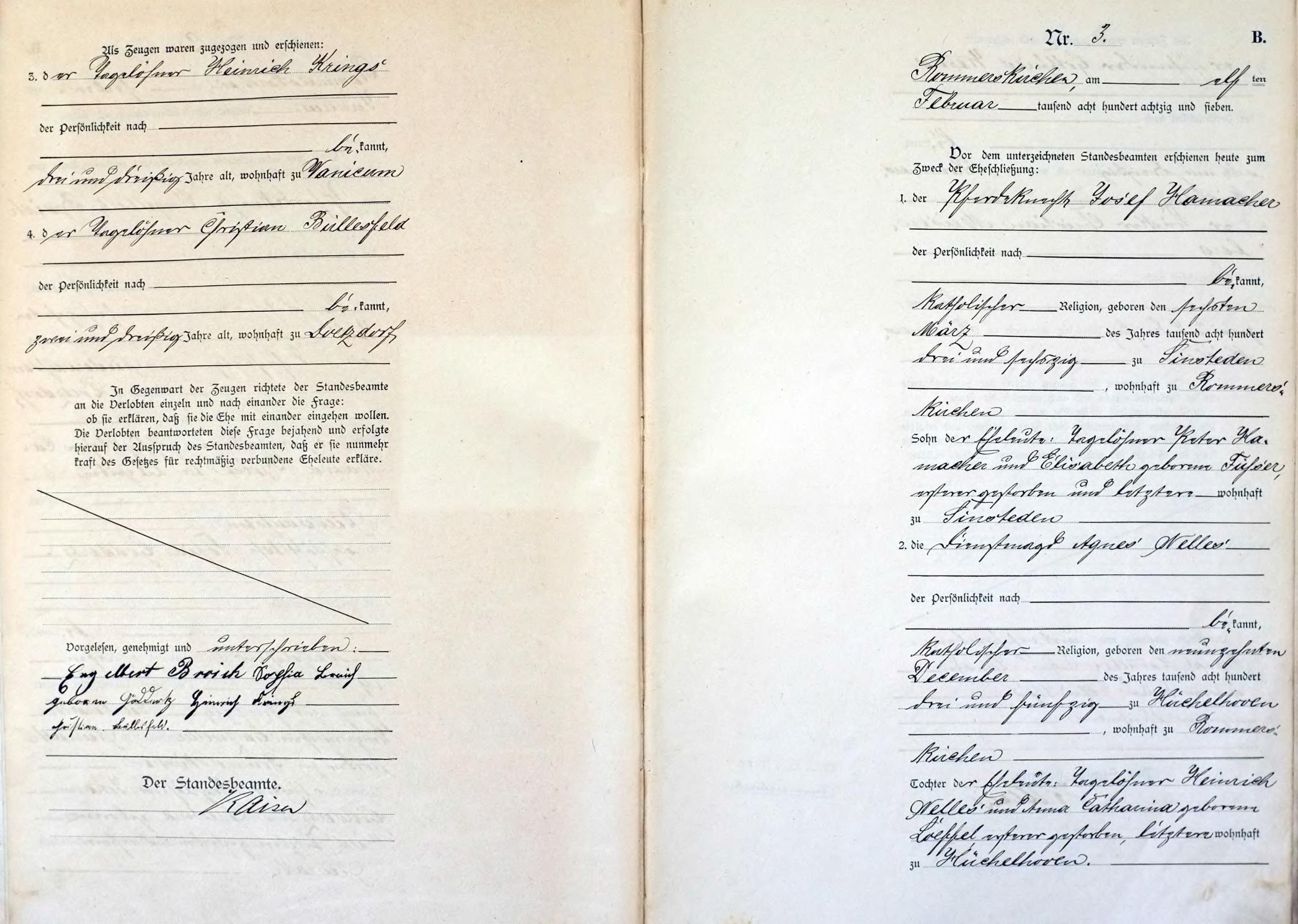 | aktuell | 11:58, 26. Nov. 2011 | 1.577 × 2.435, 18 Seiten (6,76 MB) | KlausErdmann (Diskussion • Beiträge) | {{Information |Beschreibung = ;Standesamt der Gemeinde Rommerskirchen, Register der Heirats-Urkunden für das Jahr 1887 |Quelle = Gemeindearchiv Rommerskirchen |Urheber = |Datum = 1887 |Scans = [[User:KlausErdmann|K |