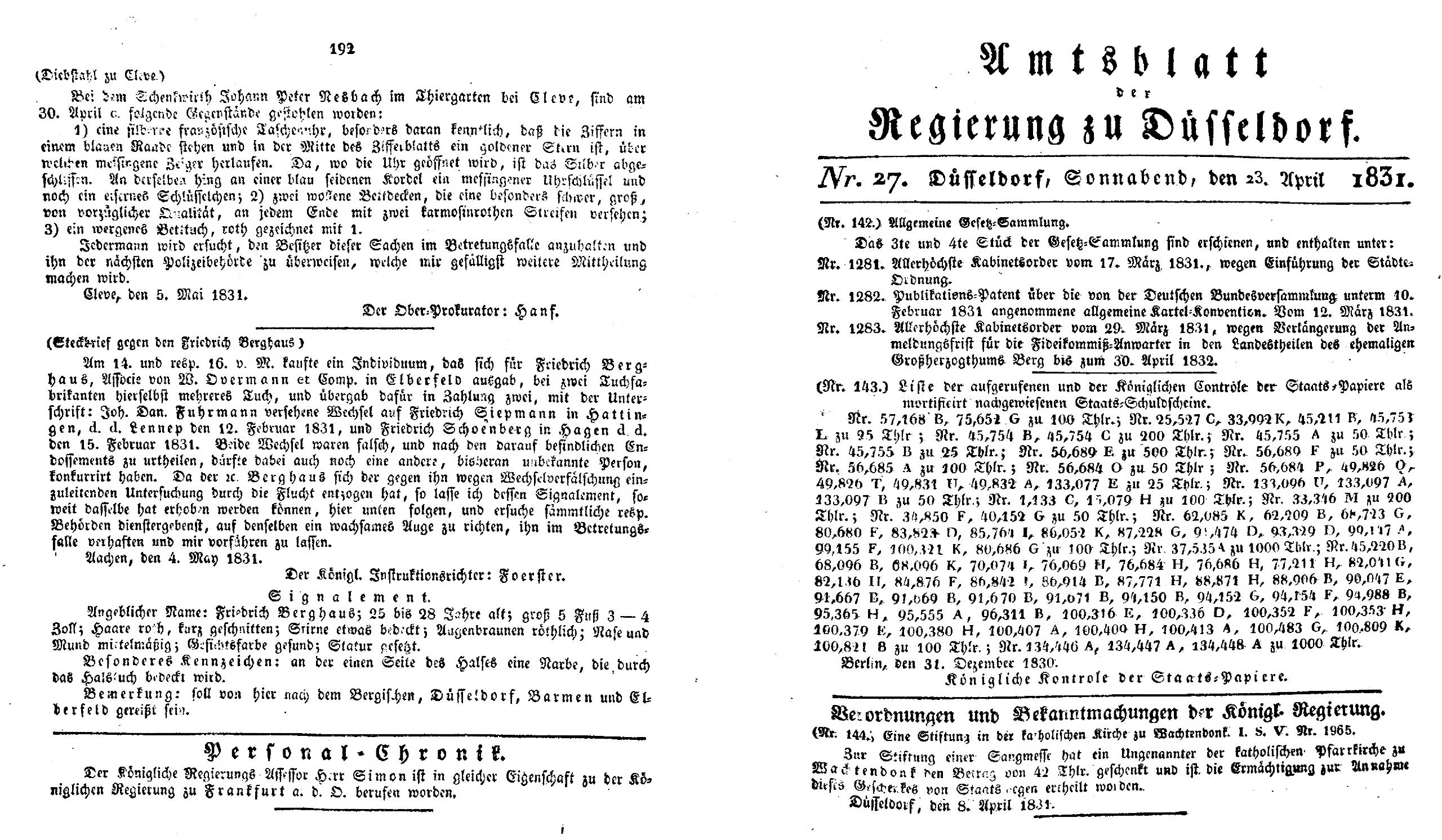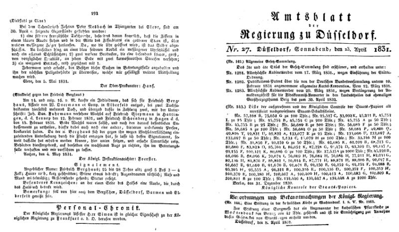 | aktuell | 08:05, 26. Mai 2012 | 2.531 × 2.933, 31 Seiten (2,94 MB) | KlausErdmann (Diskussion • Beiträge) | {{Information |Beschreibung = ;Amtsblatt der Königlichen Regierung zu Düsseldorf :Jahrgang 1831 - Mai |Quelle = Gemeindearchiv Rommerskirchen |Urheber = Scan & Repro: Klaus Erdmann ''(25.05.2012)'' |Datum = Mai 1831 |Genehmigung = |