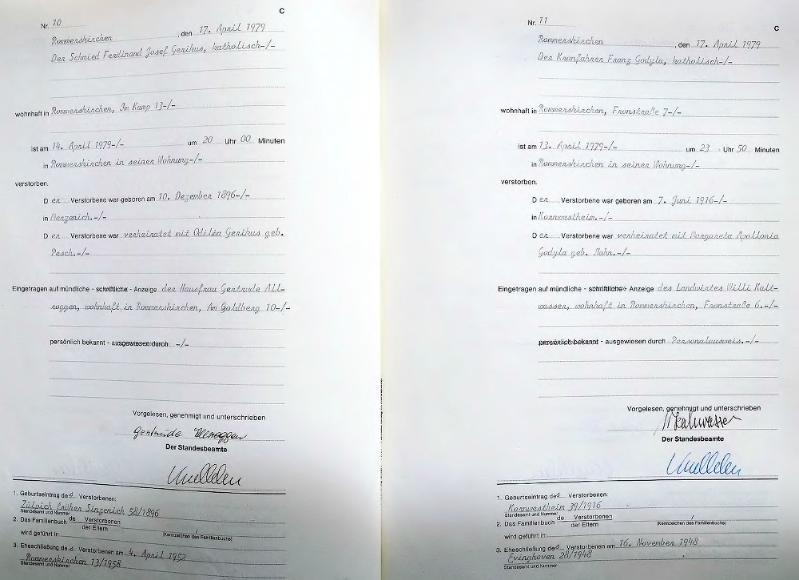 | aktuell | 11:24, 10. Jul. 2013 | 2.455 × 3.424, 27 Seiten (7,02 MB) | KlausErdmann (Diskussion • Beiträge) | {{Information |Beschreibung = ;Standesamt Rommerskirchen, Sterberegister von 1979 |Quelle = Archiv im Rhein-Kreis Neuss |Urheber = |Datum = 1979 |Scans = K. Erdmann ''(Repro: 9. Juli 2013)'' |Genehmigung |